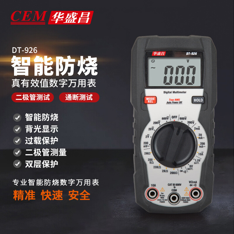 华盛昌(CEM)DT-926 数字万用表 真有效值防烧背光 高精度电工表 电流表万能表 926手动量程 智能防烧+TRMS