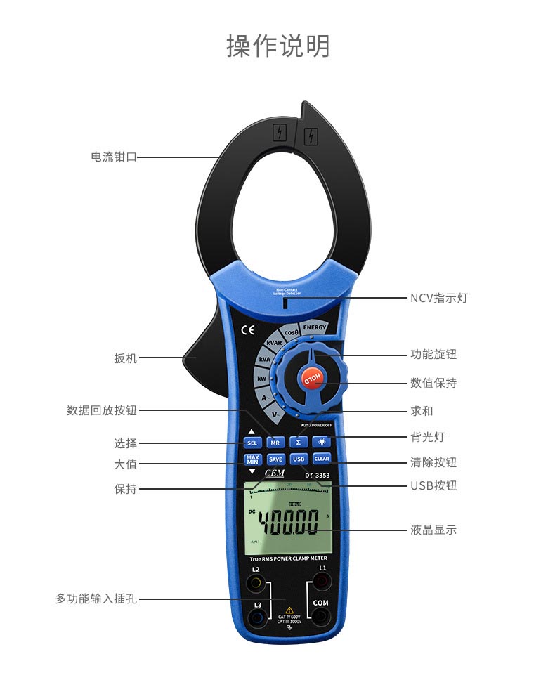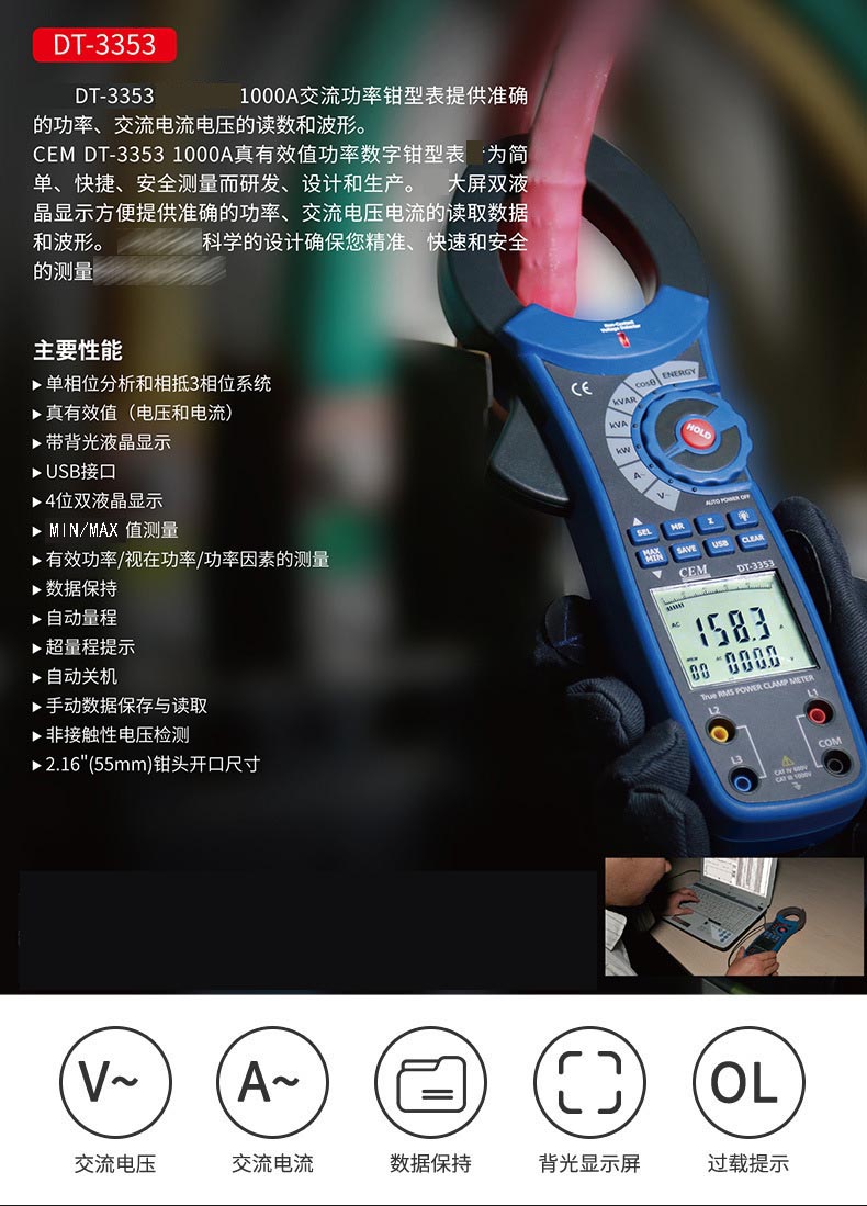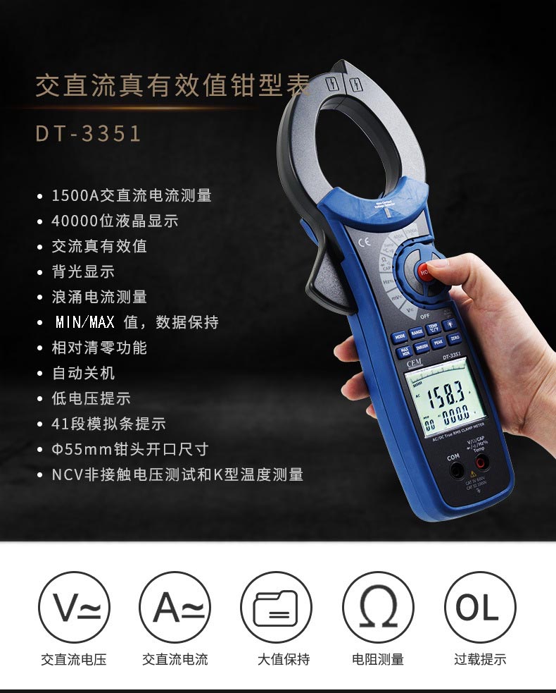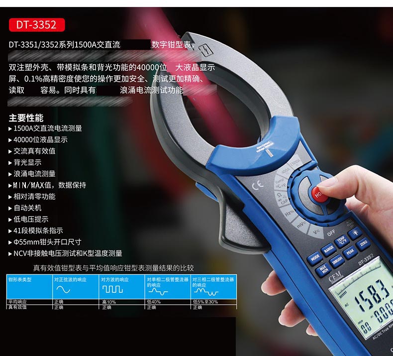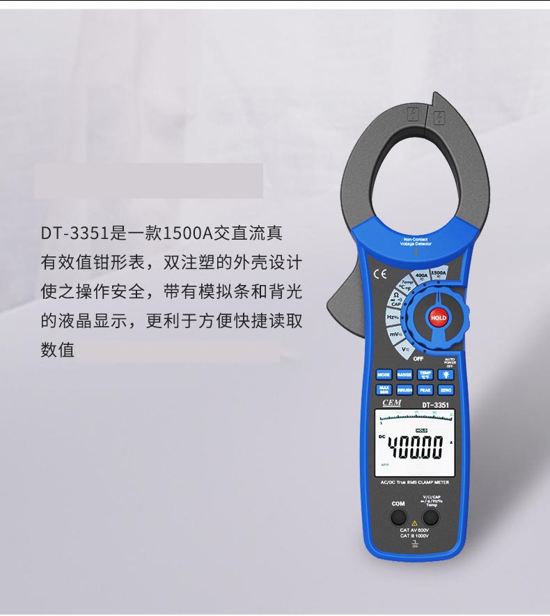 CEM华盛昌DT-3351 3352 3353真有效值1500A功率浪涌电流钳形表 DT-3352