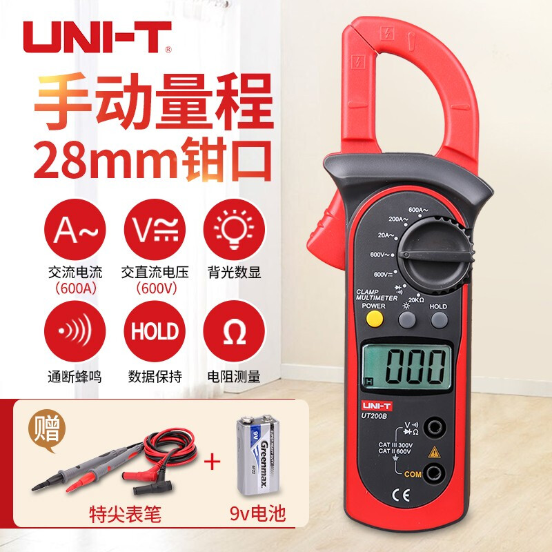 优利德(UNI-T)钳形表数字钳形万用表高精度数显电流表防烧防误测勾表 双表笔电池钳表套餐 UT200B 交流0-600A