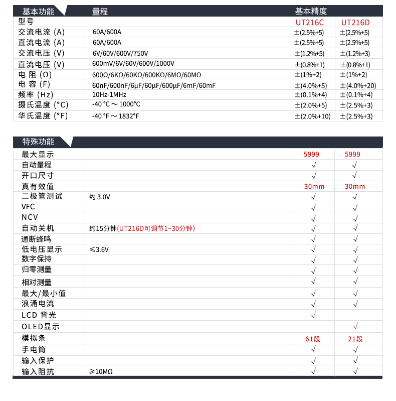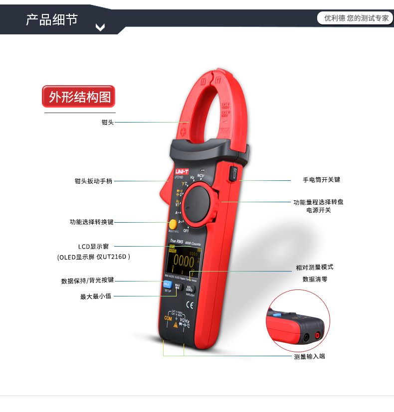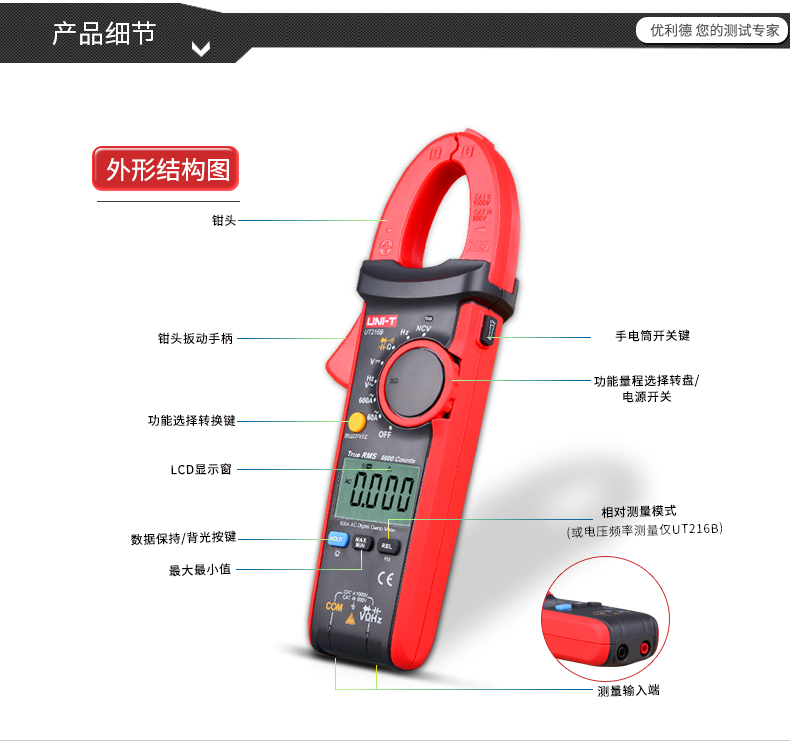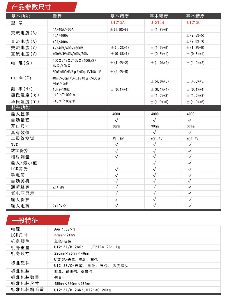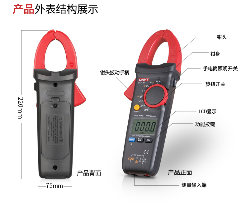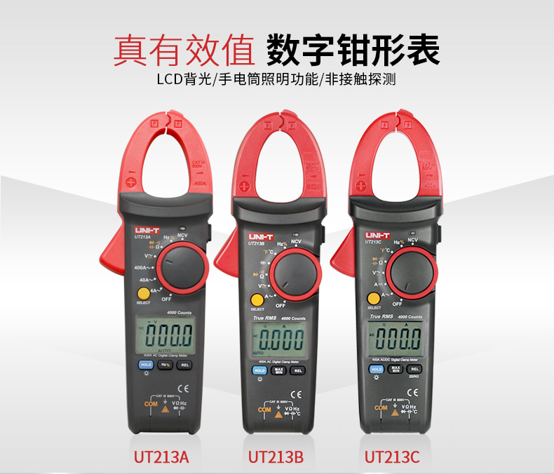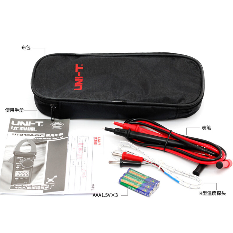 优利德(UNI-T)UT213C 钳形表真有效值数字钳形万用表数显400A交直流电流表30mm开口 UT213C 交直流 真有效值 温度测量