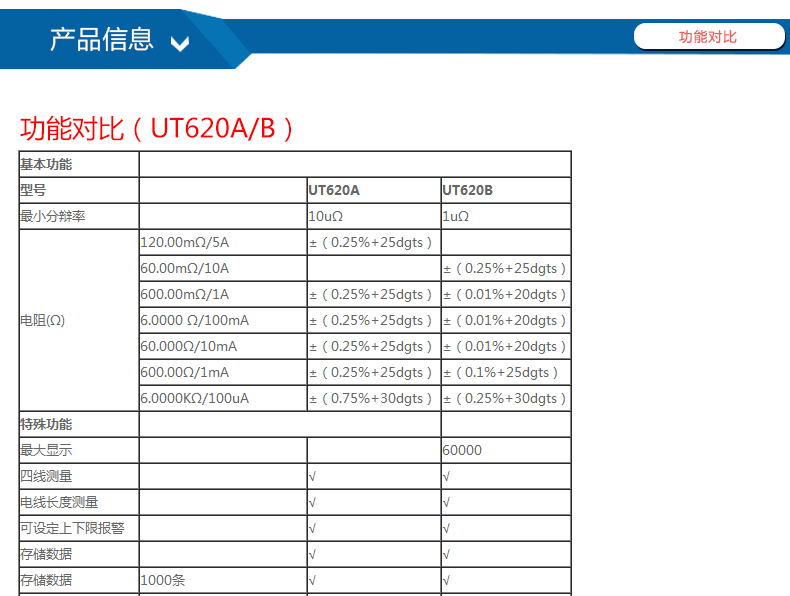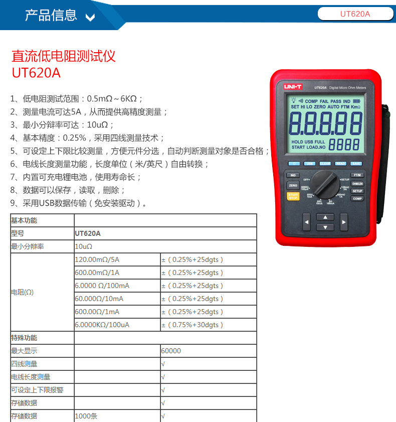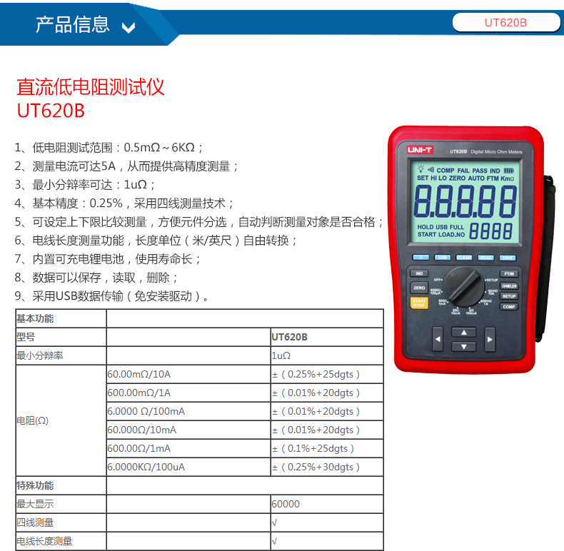 优利德UT620A 毫欧计 微欧计 UT620B 直流低电阻测试仪 四线测量 毫欧表微欧 UT620A