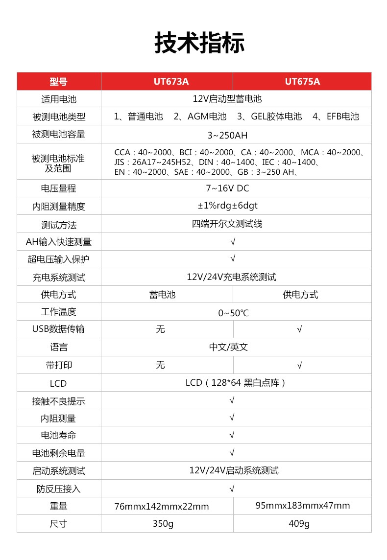优利德UT673A/UT675A蓄电池测试仪12V/24V汽车电瓶检测仪充电测试 UT673A(普通款)