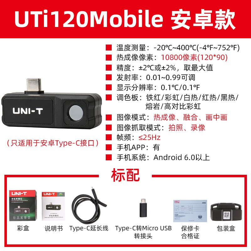 优利德(UNI-T)手机红外热成像仪高清工业测温电力检测热像仪 UTi120Mobile(-20℃~400℃)
