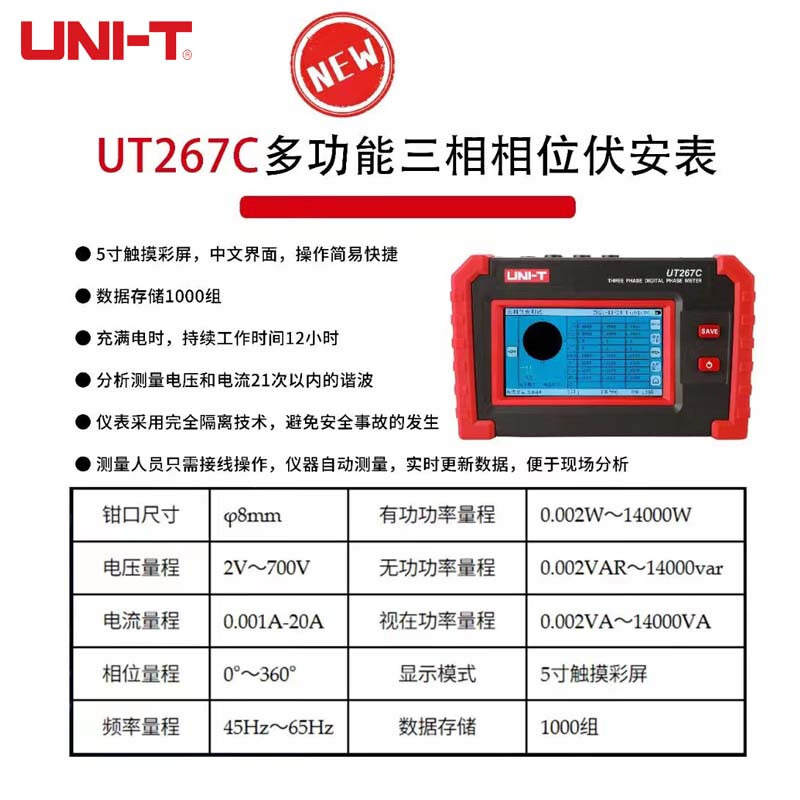 优利德(UNI-T)UT267C 多功能三相相位伏安表电压电流功率因素频率测试仪电能表 UT267C