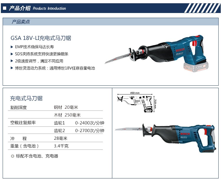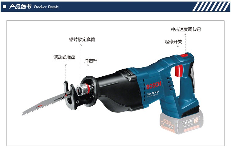 博世(BOSCH)马刀锯GSA18V-LI锂电充电式往复锯电缆木材金属切割机电锯电动工具 GSA 18V-LI主机(无电池充电器)
