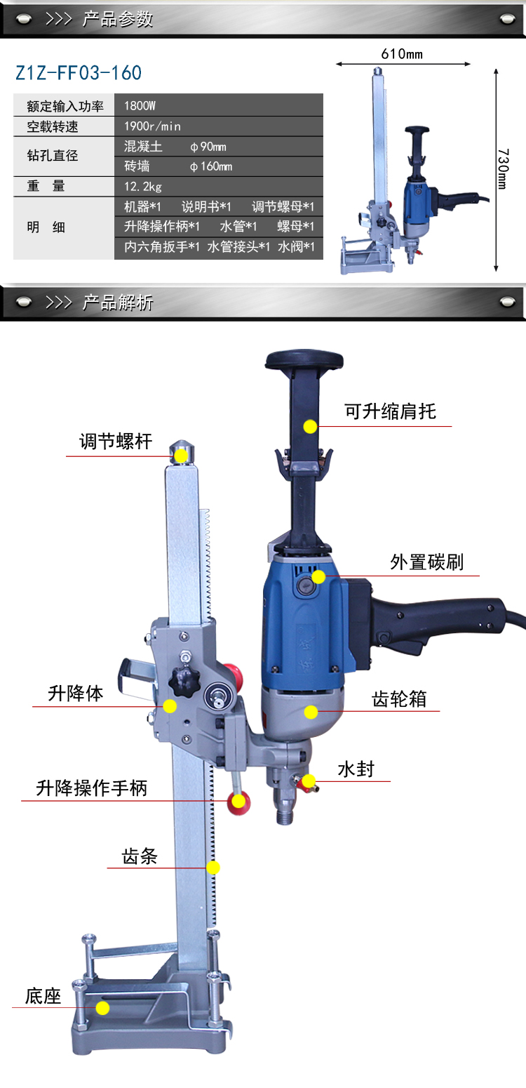 东成金钢石钻孔机Z1Z-FF03-160开孔机水钻机1800W立式/手持两用电动工具 Z1Z-FF03-160